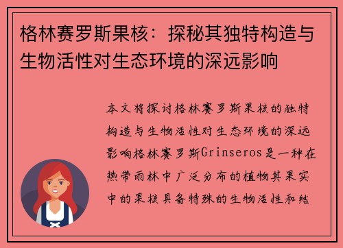 本文将探讨格林赛罗斯果核的独特构造与生物活性对生态环境的深远影响。格林赛罗斯(Grinseros)是一种在热带雨林中广泛分布的植物,其果实中的果核具备特殊的生物活性和结构特征,能够对其生境中的生态系统产生深远影响。首先,本文将分析格林赛罗斯果核的独特构造,包括其生物学结构和物理特性。其次,文章将探讨果核的生物活性,如其在防御机制中的作用及其与其他物种的相互作用。接着,讨论格林赛罗斯果核在生态系统中的影响,包括其对土壤质量和植物生长的影响,最后分析其在全球气候变化和生态修复中的潜在应用。通过对这些方面的分析,我们可以更全面地理解格林赛罗斯果核在生态环境中的重要性及其对未来生态保护和修复的潜在贡献。